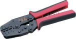Crimpzange click'n'crimp Elektrotechnik-Set, 106000Patentiertes Presswerkzeugsystem; Presszange mit 3 auswechselbaren Pressprofileinsätzen, die durch eine Rasthalterung im Zangenkörper fixiert werden, dadurch sekundenschneller Profilwechsel ohne Zuhilfenahme weiteren Werkzeugs, die beiden aktuell nicht im Einsatz stehenden Pressprofileinsätze werden in den beiden in die Zangenschenkel integrierten Magazinhaltern unverlierbar aufbewahrt. Mit click'n'crimp werden gegenüber anderen Systempresszangen bzw. Einzelwerkzeugen Zeit, Platz, Gewicht und Kosten gespart, Zangenkörper aus starkem, spezial vergütetem, gehärtetem Stahlblech mit Hebelübersetzung für geringen Handkraftaufwand, stellbare Ratschenmechanik mit Zwangsentriegelung für normgerechten Pressdruck, ergonomische 2-Komponenten-Griffhüllen.