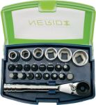 Set di punte e bussole NERIOX da 24 pezzi, in pratica scatola di plastica, con 15 punte da 1/4" C 6.3, 1 supporto per bussole da 1/4" - C 6.3, 1 portapunte a cambio rapido da 1/4" E 6.3 e 1 mini cricchetto da 1/4", 52 denti con leva reversibile.
