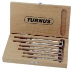 Set di cacciaviti da orologiaio 1Realizzato in ottone, nichelato, per viti con intaglio, con lame fisse, set di 6 pezzi, in custodia di legno.