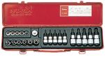 Set di chiavi a bussola per viti TORX® KOKEN 3/8"+1/2" / 22 pezzi / ETH 3001KokenETH3001, acciaio al cromo-molibdeno, cromato, in scatola metallica, contenente:11 bussole per viti TORX® esterne E4...E1810 bussole per viti TORX® interne T10...T551 pezzo di transizione 1/2" attacco quadro - 3/8" attacco quadro
