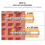 Der CELO Multifunktionsrahmendübel MFR ist in drei Durchmessern (8, 10, 14), verschiedenen Schraubenwerkstoffen und Ausführungen erhältlich. Geprüfte Sicherheit bietet der MFR in Verbindung mit den MFR-Schrauben aufgrund seiner Europäisch Technischen Zulassung. Er ist für Fassadenunterkonstruktionen sowie für Anbauteile aus Holz und Metall für alle gängigen Untergründe geeignet. Sein langer Spreizbereich und die Vierfach-Spreizung mit seitlichem Balken sorgen für sicheren Halt in fast alle Untergründe. Die Zulassung gilt für Beton, Vollsteine, Lochsteine und Porenbeton. Dies ermöglicht eine geringe Lagerhaltung und Kostenersparnis im Einkauf. Durch die vormontiere Schraube und die zwei verschiedenen Setztiefen in allen Baustoffen ist der MFR einfach und flexibel in seiner Handhabung.